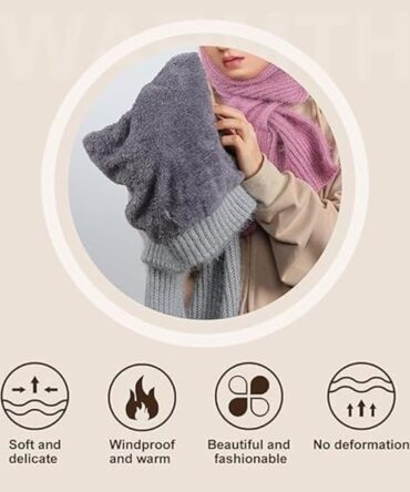ShopBridge 2 in 1 Windproof Scarf with Cap Integrated Ear Guard Hat Plus Velvet, Winter Warm Soft Knitted Beanie Hats Scarf- Woolen Lovely Muffler Fur Cap Stylish Headwear for Women & Girls