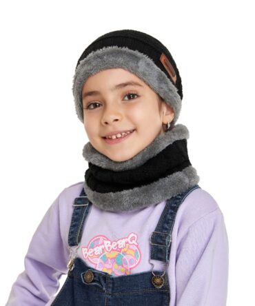 Fantastic Zone Kids Winter Beanie Hat and Scarf Set Warm Knit Beanie Cap and Circle Scarf with Fleece Lining for Kids Boys Girls, 2-Pieces Black