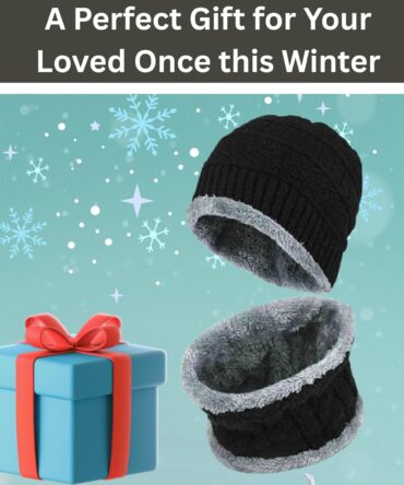 NESVIB 2 Pairs Men’s & Women’s Snow Proof,Inside Fur, Warm Woolen Cap with Neck Muffler/Neck Warmer/Scarf for Winters – Free Size (2 Pairs Black)