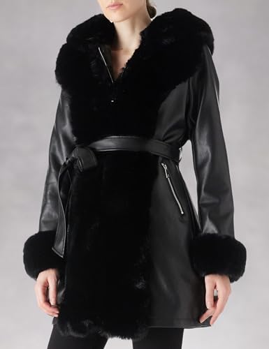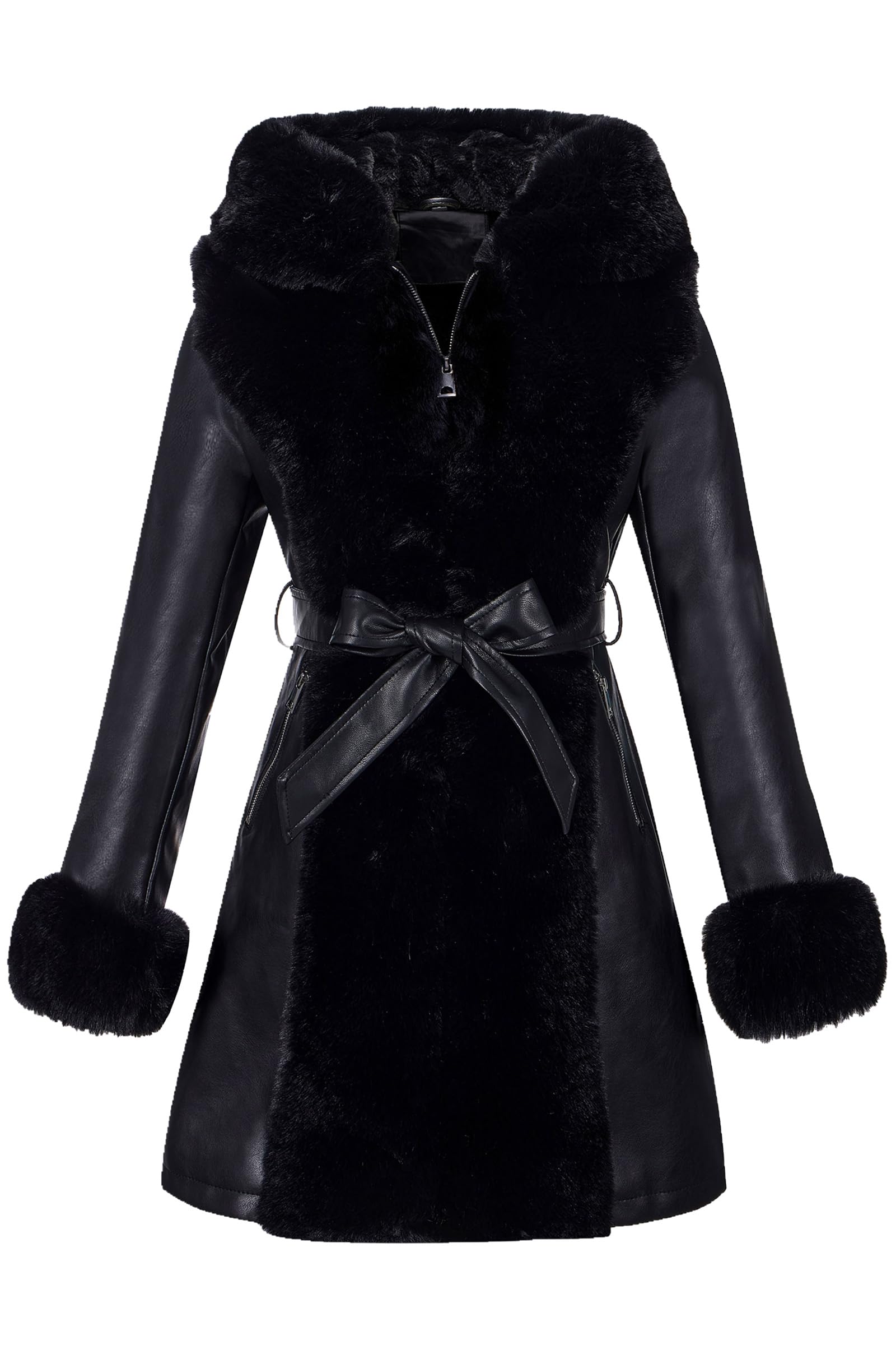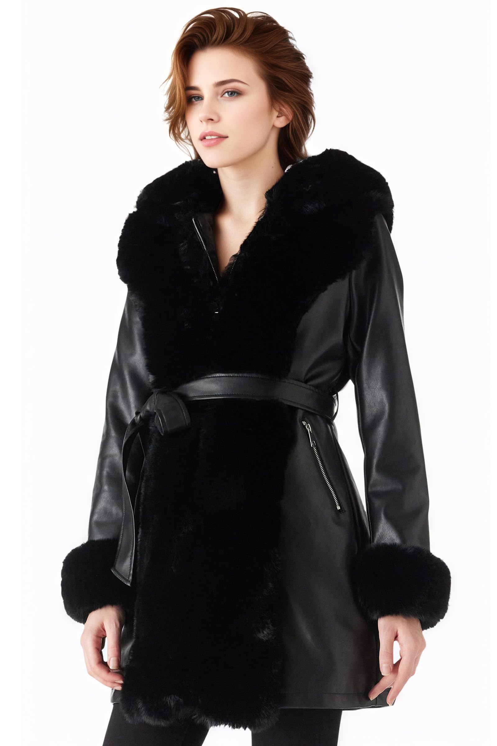 - Feature: The faux leather jacket women is designed with faux fur long collar extends to bottom, with fur hood, fur lined, fur cuffs, zip up closure, long sleeves, two furry side pockets,removable belt. Combined with fashion adjustable belt element, which touched snug and soft fuzzy coat for women. Well-made, unique design style can show your charm and vitality, add a sense of elegance and exquisite even in cold temperatures.