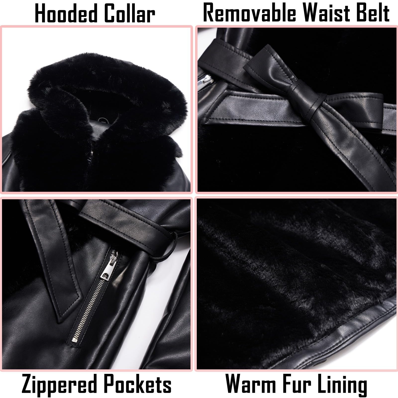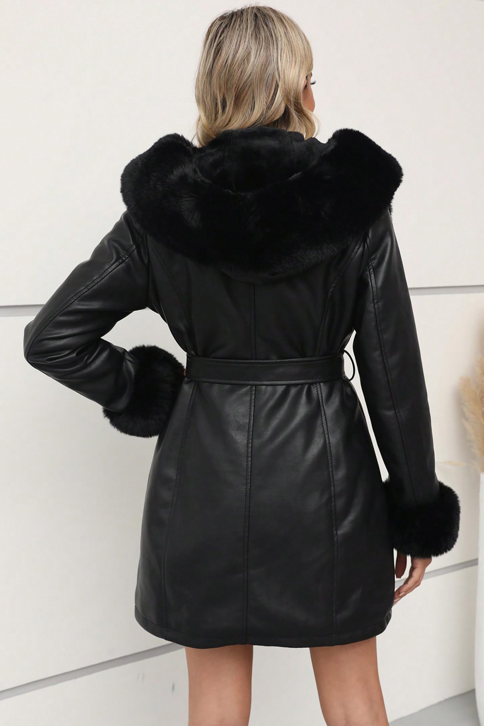 Details: faux leather jacket women faux fur coat faux fur lined coat women fuzzy fluffy furry 2024 fall winter warm sherpa lined jacket fleece wool shearling thermal overcoat hooded hood belted belt heavy thicken collar cold weather fashion style wind-proof autumn spring zip up outerwear outwear ladies girls woman womans oversized oversize trendy stylish classic high-quality gift casual clothing clothes breathable comfort elegant durable wind resistant sport travel mother mom girl friend beloved